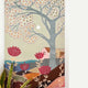 Beneath a golden sky, the deer stands still lost in nature’s rhythm, where blossoms, waves, and silence breathe together.